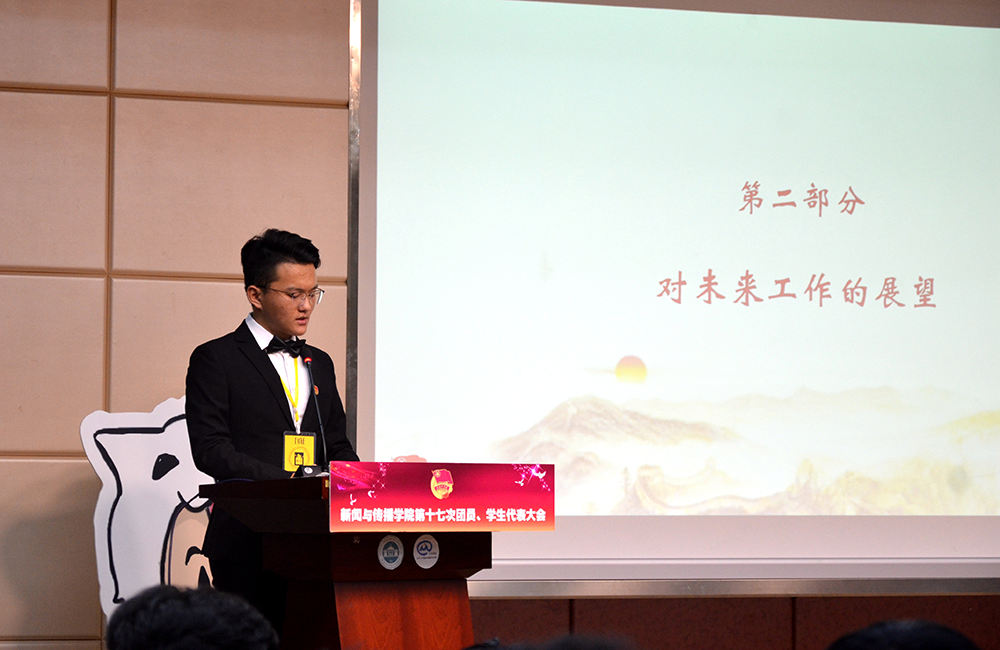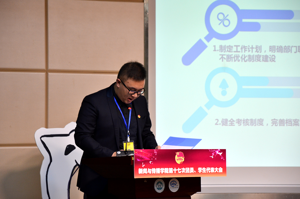 随后,校学生会常务副主席陈煜桦同学首先表达了对过去一年新闻院团学工作的肯定和认同,其次他作为同样从事团学工作的同学对未来一年的哔哩轻小说 团学工作提出了完善体制建设,开展网上学生会工作等建议。