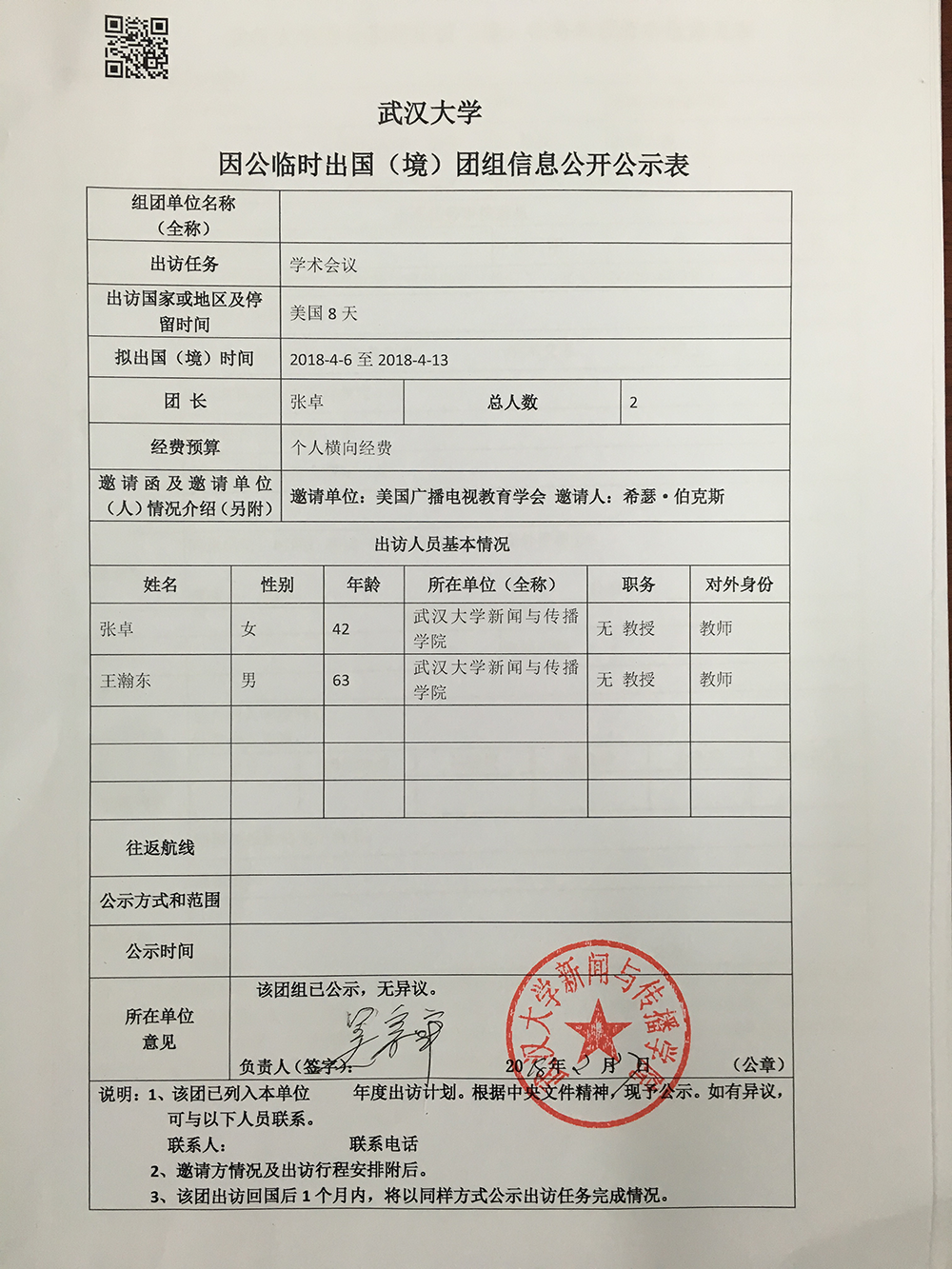 哔哩轻小说 因公临时出国(境)公示表(张卓)