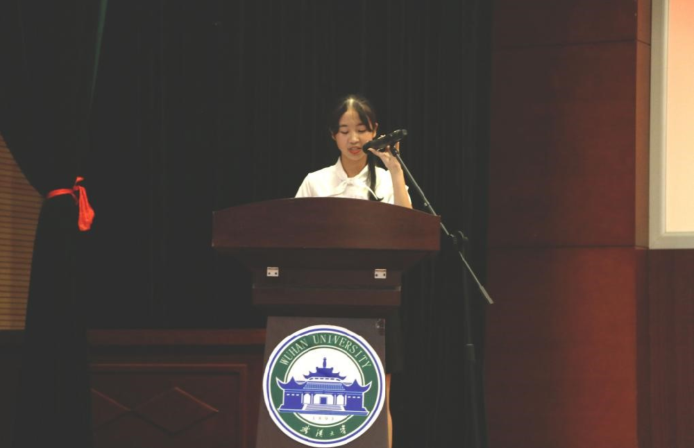 然后,史方雅作为本科生代表上台发言。作为一名刚刚踏入大学校园的大一新生,她憧憬着武大校园的生活,更热爱着武大新传的自由。她借“确认过眼神,我遇见对的专业”的一句话,坚定地表达出想要成为一名“有思想、负责任”媒体人的信心与决心。谈到未来,谈到武大,谈到新传,她说:往后余生,请多多指教。