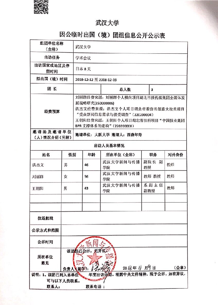 哔哩轻小说 因公临时出国(境)公示表(洪杰文、刘丽群、王朝阳)