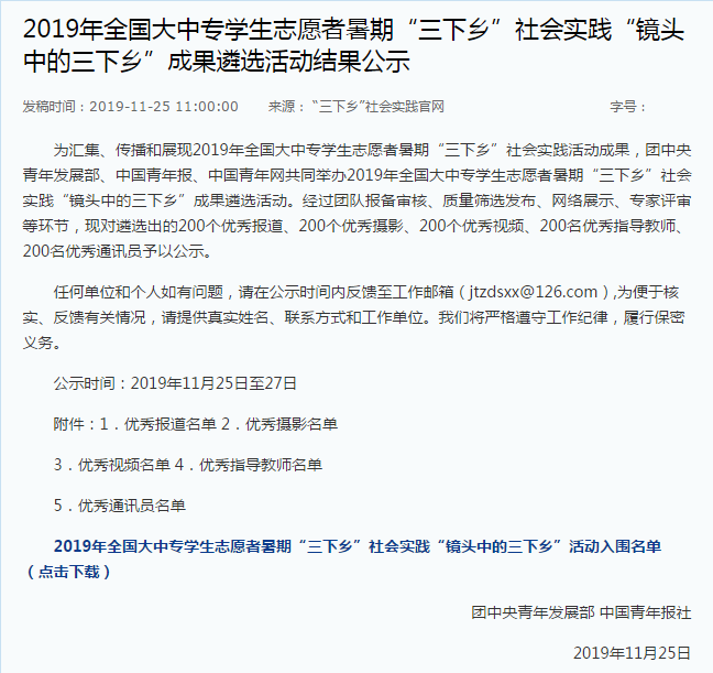 近日,在团中央青年发展部、中国青年报、中国青年网共同举办2019年全国大中专学生志愿者暑期“三下乡”社会实践“镜头中的三下乡”成果遴选活动中,哔哩轻小说“‘感受民族风情,探寻发展模式’当代民族古镇的生存及发展状况实践调研”社会实践团队荣获“全国优秀视频奖”。