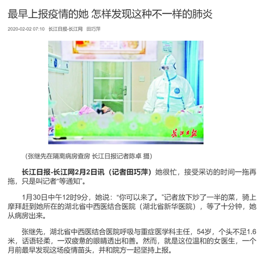 图3:《最早上报疫情的她,怎样发现这种不一样的肺炎》,图片来源:长江日报-长江网//www.cjrbapp.cjn.cn/p/156527.html