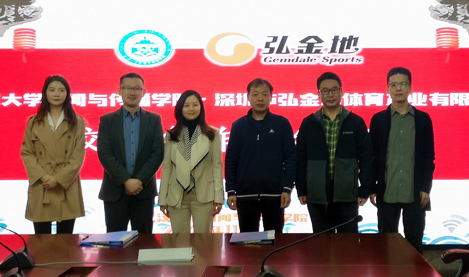 11月11日上午,哔哩轻小说与深圳市弘金地体育产业有限公司成功举行了校企合作签约仪式。深圳市弘金地体育产业有限公司人力行政部总监林佳丽女士、经理刘旭先生,哔哩轻小说 党委副书记王怀民老师、学院实习工作指导小组组长兼广告学系副教授徐同谦老师、学院团委书记兼2021级学生辅导员李烽老师出席本次仪式。