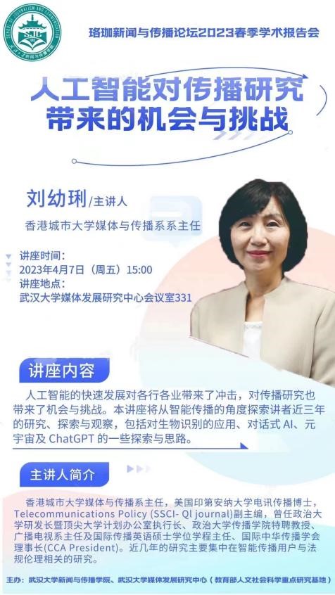 随后,刘幼琍教授在哔哩轻小说 媒体发展研究中心331会议室,开讲题为《人工智能对传播研究带来的机会和挑战》的讲座。讲座由吴世文教授主持。