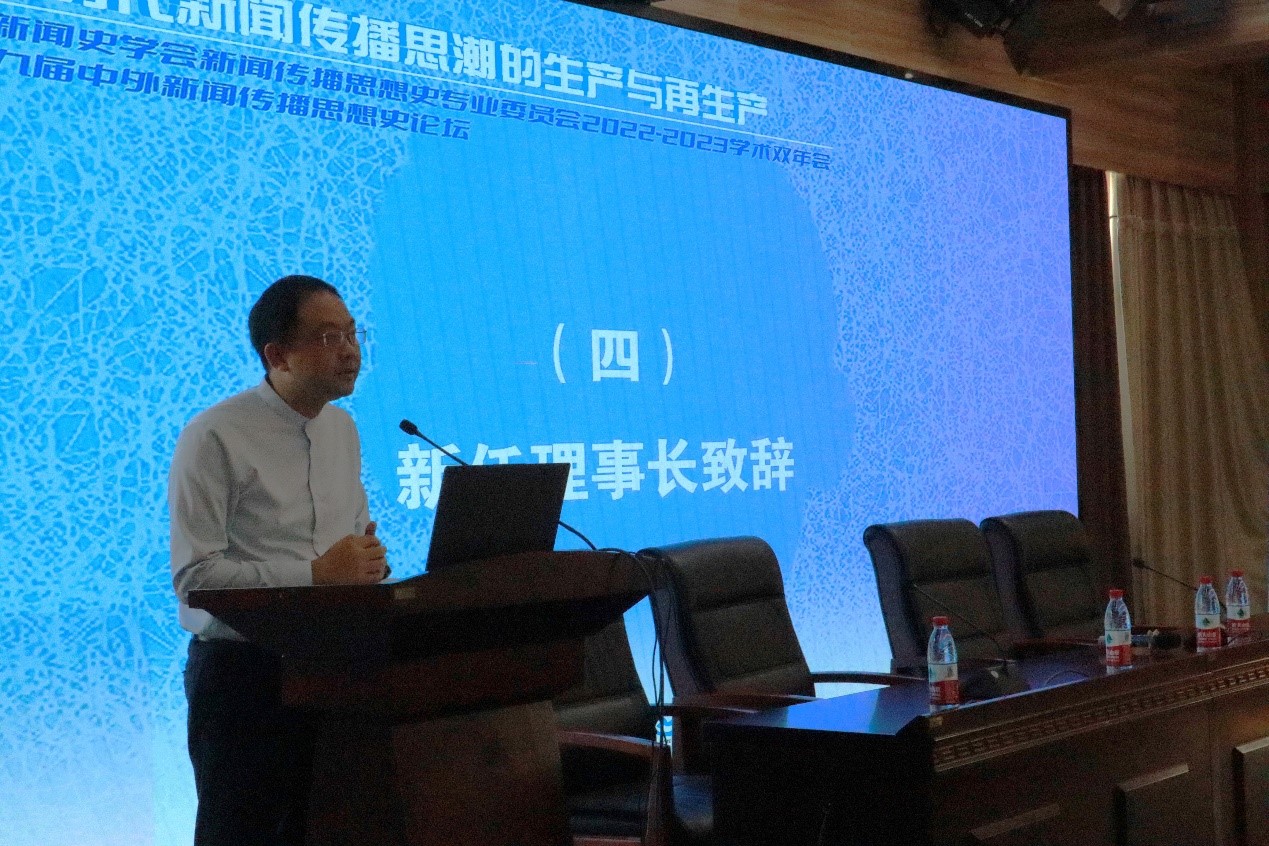 中国新闻史学会会长、中国人民大学王润泽教授致辞。她首先回顾了中国新闻史学会新闻传播思想史专业委员会的历史,总结了此次的换届工作,学界应在自主知识体系方面的创建继续发挥作用,强调思想观念在新闻传播学科的重要性和引领性。她表示,在媒介技术迅速更新换代的背景下人类社会正处于从工业文明进入信息文明,工业文明的逻辑,被信息文明的逻辑取代的时期。学界可以此为契机、以我国在互联网领域较为领先的实践和产品为背景,提出信息文明时代新闻传播的自主知识体系的重要核心概念和理论体系。