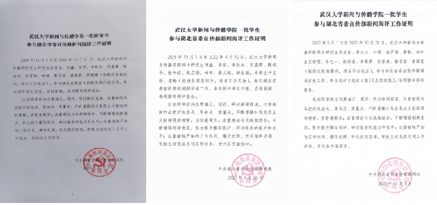 2020年11月至今,学院新闻阅评团队坚持以饱满热情和制度化方式,阅评湖北省主流媒体报道,共提交250余份、超50万字的阅评报告,阅评意见多次被省委宣传部主要领导批示。新闻专业学生参与新闻阅评工作,是新闻院系实践育人的有效举措,也是加强马克思主义新闻观教育的现实途径。