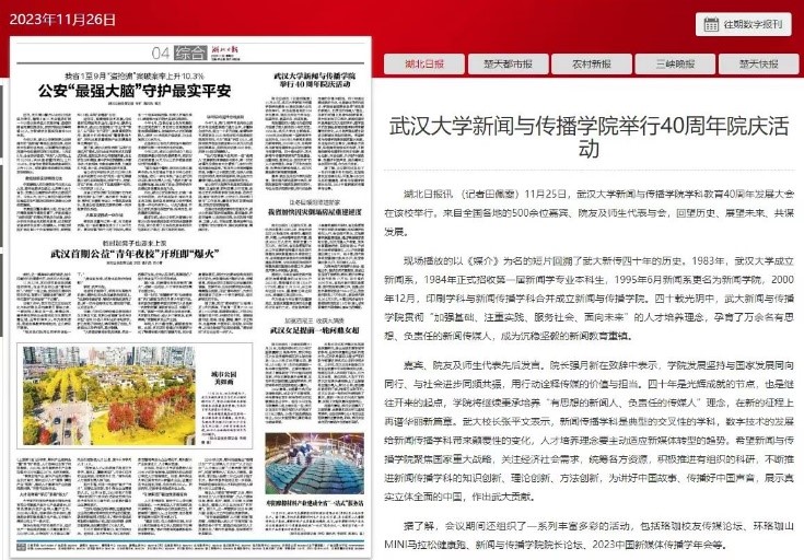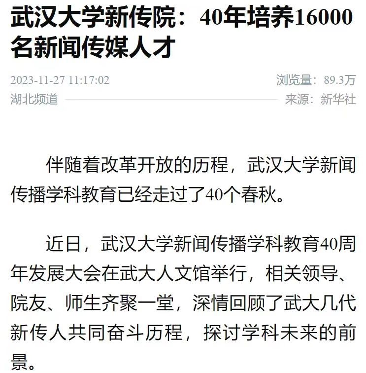 新华社的报道《哔哩轻小说 新传院:40年培养16000名新闻传媒人才》,浏览量近90万。这篇文章回顾哔哩轻小说 四十年发展历程,肯定了新传院的人才培养成果,希望哔哩轻小说 在新的征程上再谱华丽新篇章。湖北日报、学习强国、科学网均对哔哩轻小说院庆活动展开报道,肯定新传院的光辉成就,表达对新传院讲好中国故事、传播好中国声音的殷切期望。