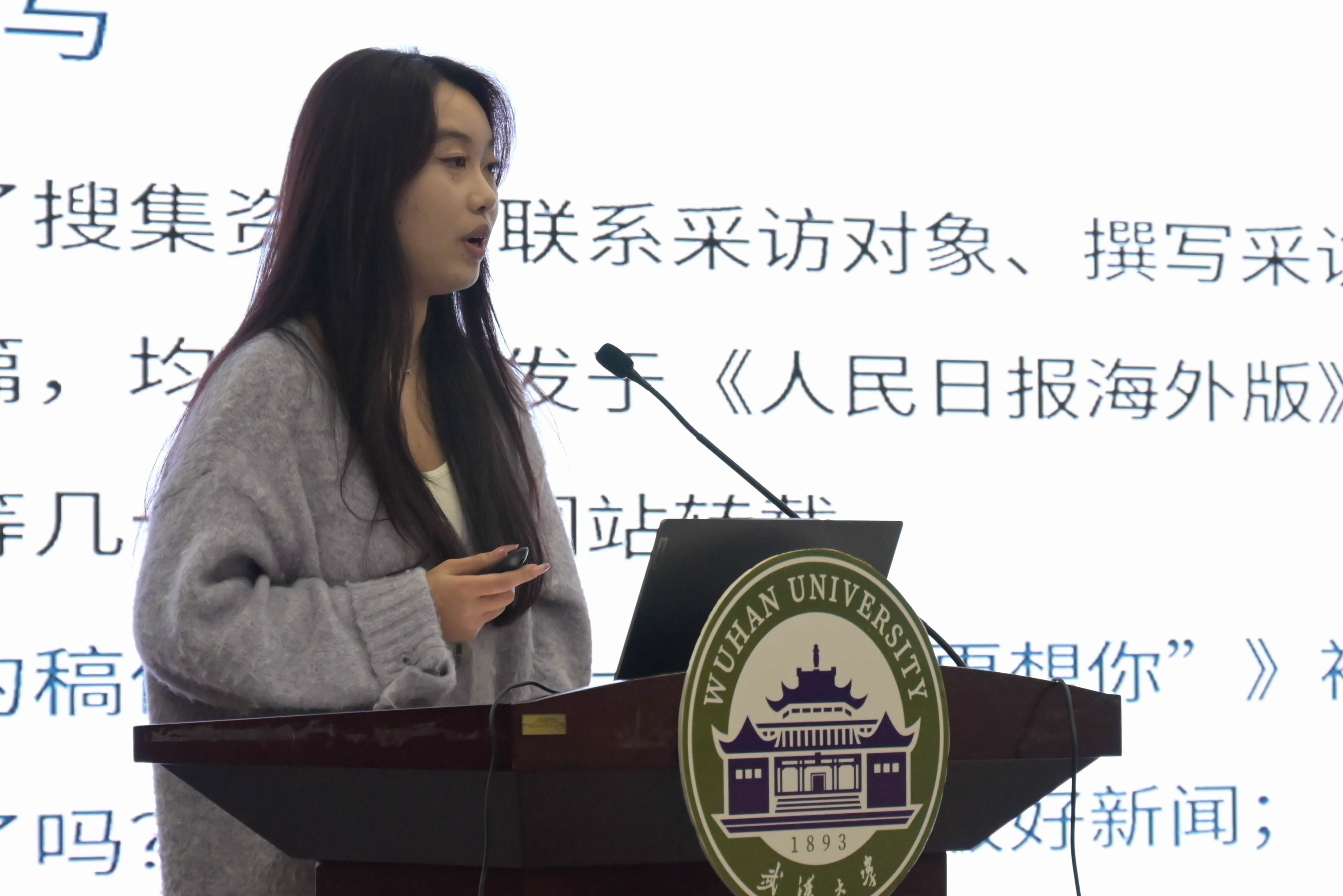 随后,七位2020级优秀本科实习生代表向2021级同学们分享了各自的实习经历与经验。来自新闻学专业的侯婧怡同学向与会同学介绍了自己在人民日报·海外版记者部的工作日常。在她看来,实习可以分为“输入、整合、输出”三个部分,建议同学们先积极与老师沟通交流,做好记录和整合,同时也要保持思考、实事求是,并主动争取机会,发挥自己的特长。