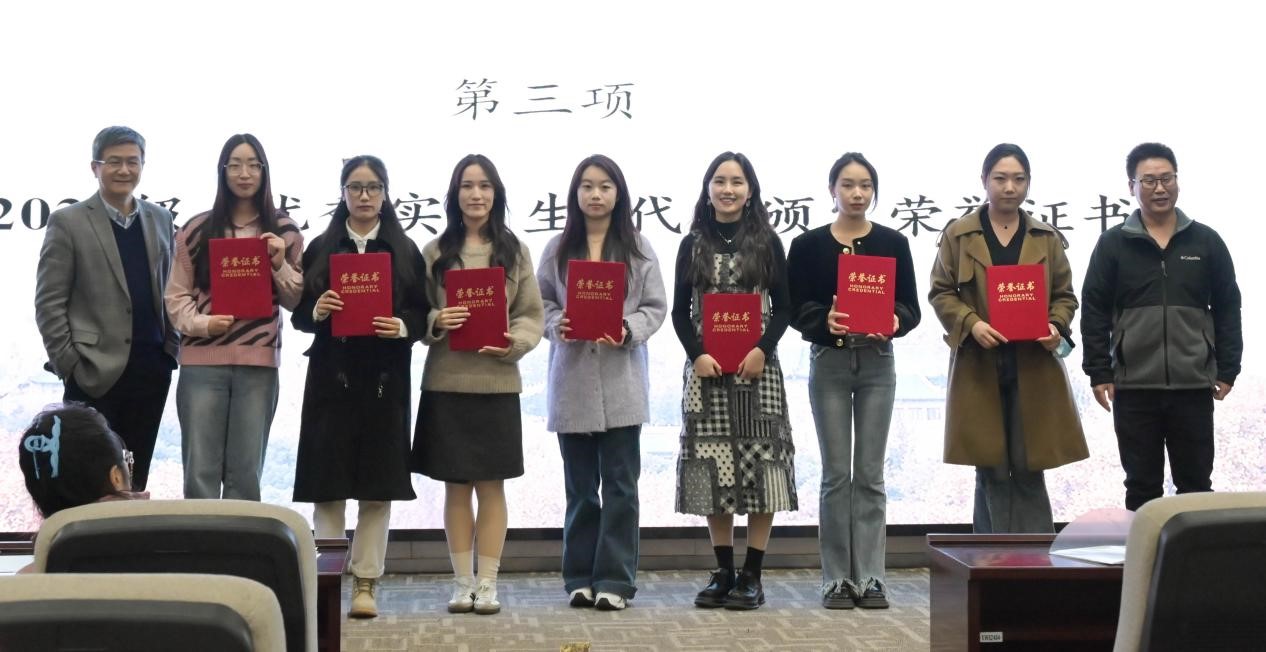 大会第二项,林婕老师宣读学院表彰决定,授予侯婧怡等65名2020级本科生“优秀实习生”称号,并由洪杰文老师和徐同谦老师为到场的优秀实习生代表颁发荣誉证书。