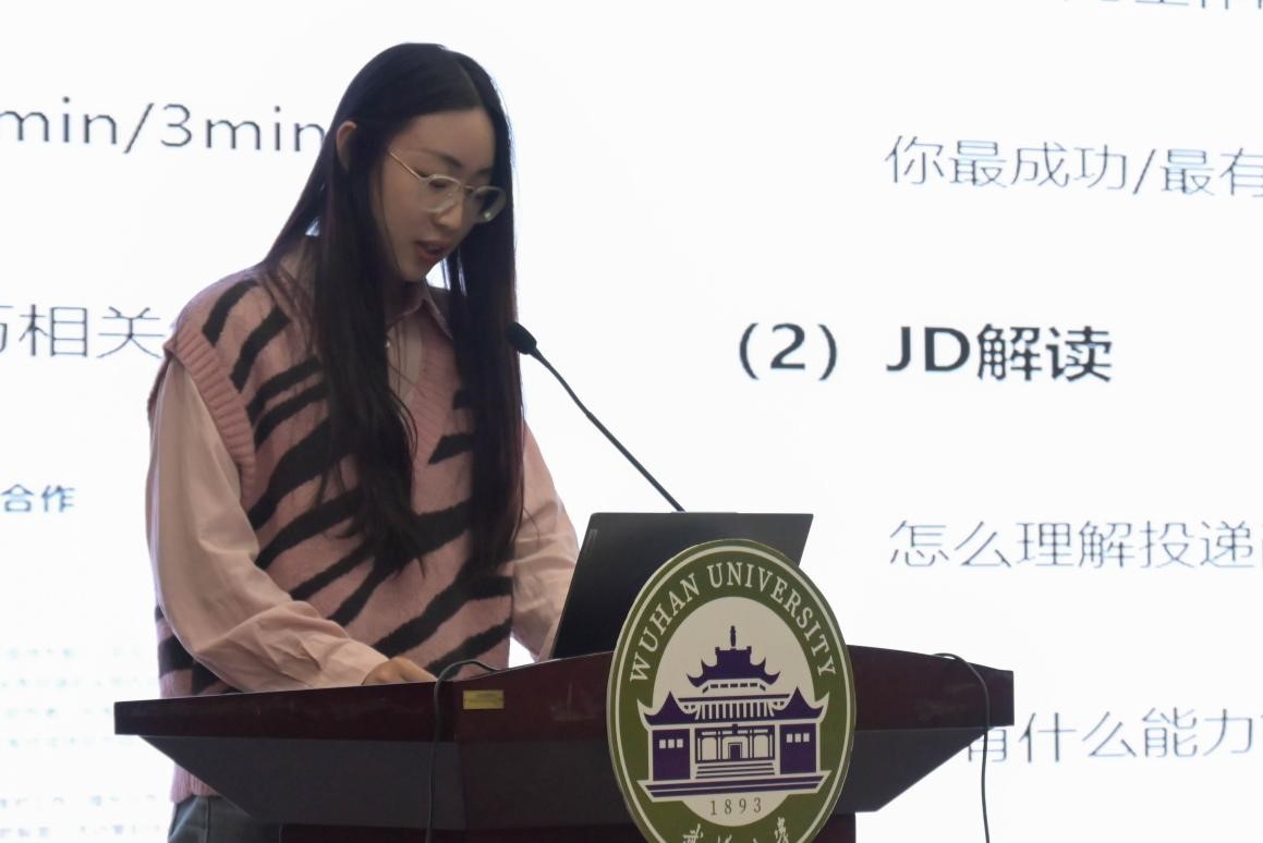 广播电视学专业的杨淳同学的实习单位是光明日报。她从光明日报的特点出发,介绍了具体的就业岗位,同时也梳理了从投递简历到求职再到正式实习的时间线,建议大家做好充足的准备。而杨辰玥同学则在字节跳动这一互联网大厂进行实习,主要负责数据统计分析、新媒体内容生产与运营。她向大家介绍了字节跳动的面试过程及内容。