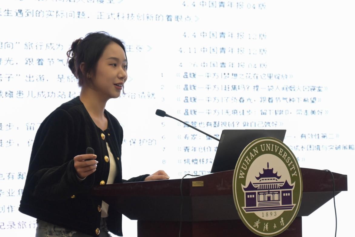 播音与主持艺术专业的张曦月向各位同学分享了她在新华社的实习经历,并将自己这一段工作的过程定义成三个不同的职位:“记者”、“2023中国青年论坛负责人”、“内容运营者”。同样来自播音班的吴雨珊同学则介绍了在中国青年报经历的新闻采编、节目策划与拍摄、推送排版等工作。她认为,实习最重要的是“主动发现机会”,培养新闻的敏感度,更要始终保持自信,勇于挑战。