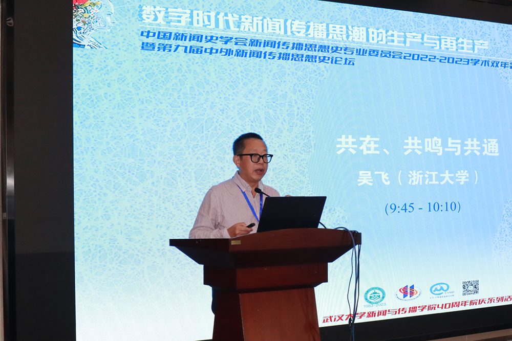浙江大学传媒与国际文化学院吴飞教授的演讲以“共在、共鸣与共通”为主题。他尝试在数字时代背景下进一步发展哈贝马斯的公共领域理论,提出应使用后退一步的数字“共通”来替代“共识”,不再强求协商一致,而是通过多元的行动者网络这样一个共鸣的、共显的空间将参与者的差异性和独立性充分地彰显出来。他认为,共同体的观念是承认人类必须共在同一个世界里面,不追求统一,但强调有限性的共享,本质上就是共通。
