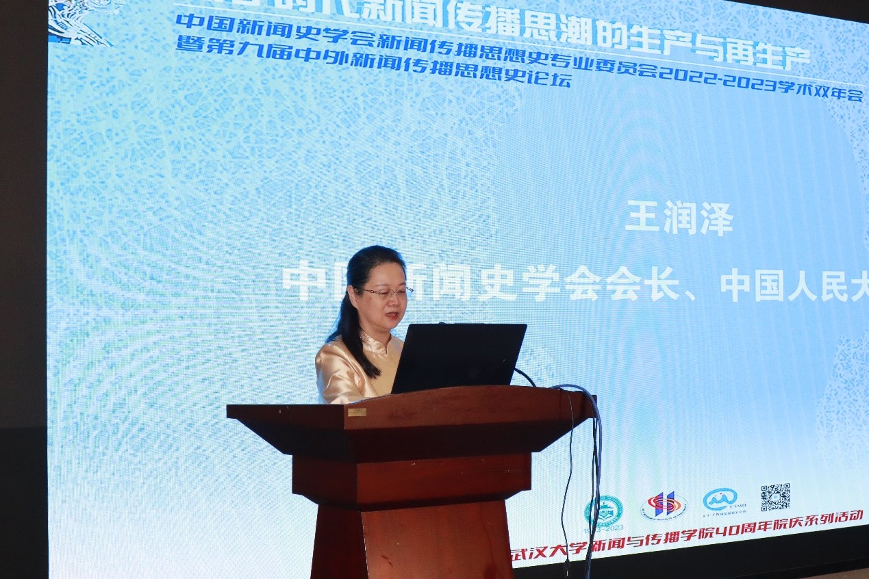 中国新闻史学会会长、中国人民大学王润泽教授致辞。她首先回顾了中国新闻史学会新闻传播思想史专业委员会的历史,总结了此次的换届工作,学界应在自主知识体系方面的创建继续发挥作用,强调思想观念在新闻传播学科的重要性和引领性。她表示,在媒介技术迅速更新换代的背景下人类社会正处于从工业文明进入信息文明,工业文明的逻辑,被信息文明的逻辑取代的时期。学界可以此为契机、以我国在互联网领域较为领先的实践和产品为背景,提出信息文明时代新闻传播的自主知识体系的重要核心概念和理论体系。