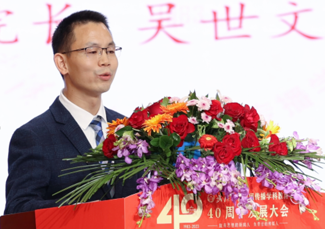 武汉大学新闻与传播学院副院长吴世文教授作为青年教师代表发言,他用“前辈”“传统”“初心”三个关键词讲述了他在武大新闻学院的所见所感,他表示,青年教师将在新的时代条件下立德树人,不改初心,敬畏学术,实质创新,奉献社会,日益精进。由学术、学者、学生和学心构成的武大新传共同体,也将会打造武汉大学新闻传播教育新的传奇。