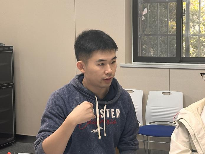 新闻学系的周呈思老师,目前担任2024级大类1班的班级导师。他在分享时反复提及“实践”的重要性。周老师在设计课程提纲时,一直秉持实践比例不低于整体课程比例的三分之一。围绕媒体业界真实情境、紧密贴合现实新闻事件,举行模拟媒体采前会/编前会、模拟突发事件通讯社策划会、模拟融合新闻采编实践及其他仿真课程实践活动,受到学生们的欢迎和好评。