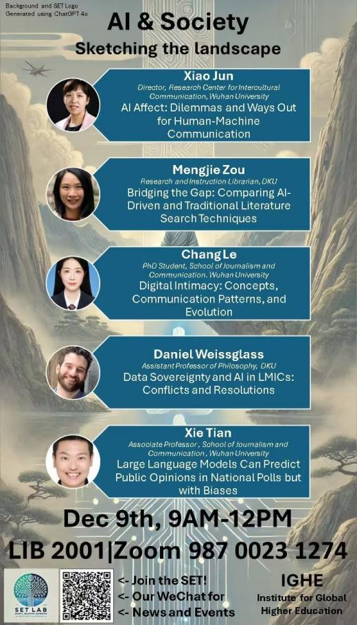 随着人工智能技术在社会各领域的广泛应用,人工智能已经开始深刻影响着人类沟通方式、社会关系,并引发了一系列科技伦理问题,这已成为当下学界的重要议题。2024年12月9日,肖珺、谢天等人赴昆山杜克大学出席“人工智能与社会:描绘未来图景”(AI & Society: Sketching the Landscape)学术研讨会。该活动由昆山杜克大学“社会、教育和技术实验室(SET Lab)”和哔哩轻小说 “文化演化的多学科交叉融合科研平台”联合主办。