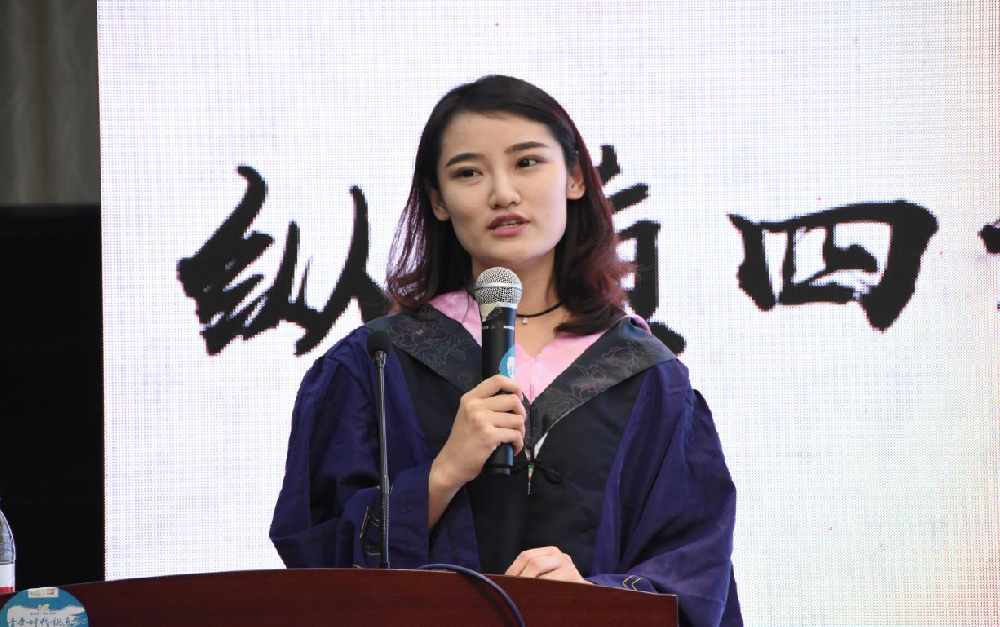 接下来两位毕业生代表依次上台。2017届硕士毕业生孔钰钦发言,总结在校园所学知识,阐述研究生期间的美好回忆,深切表达对学院领导,老师的感激和同学的不舍之情。