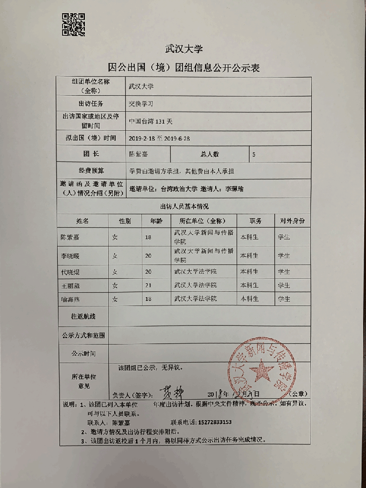 武汉汉大学因公临时出国(境)公示表(陈紫嘉等)