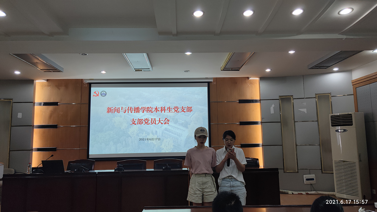 6月17日下午,新闻与传播学院本科生党支部党员大会在二楼报告厅举行,支部书记曾文鹏同志、支部监察委员余文嘉同志等91名党员参加了大会,其中正式党员17名。